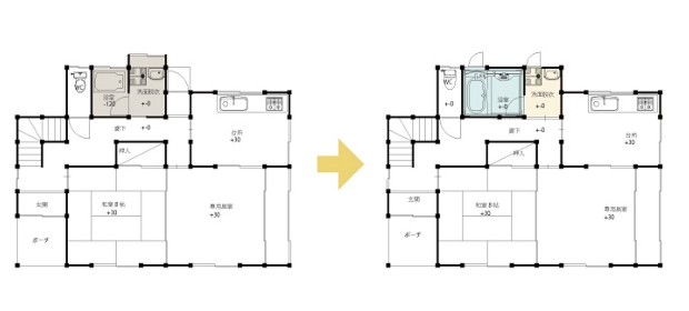 現在のスペースでは益々負担となる介助入浴もままならない事や、内開きドアなどにより安心した入浴は不可能です、最低でも1.820mm×2.275mmの寸法の浴室を整備したいところでありますが、幸いにも勝手口部分を増床(増築910mm×910mm)する事が容易に出来ると判断したため、ゆったりとしたスペースの確保が出来きました。