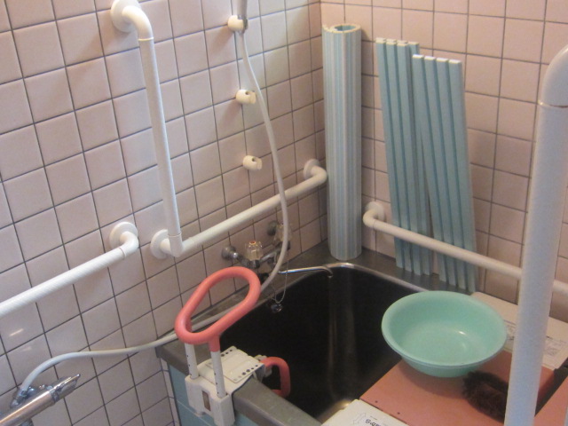 排泄はリハパンとパットですが、定時にトイレ誘導を行っておりタイミングが合えばトイレでの排泄が可能です、また入浴ですが、現在の浴室(1.820mm×1.365mm)は本人の動きを見て、以前に適正だと思われる位置に手すりの設置などを行ってきましたが、絶対的な狭さが入浴介助の妨げとなっています。